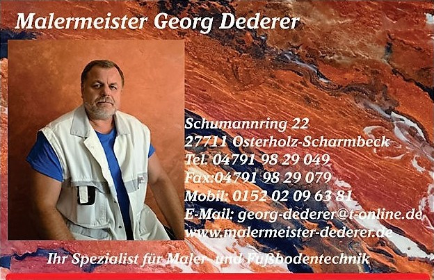 Schumannring 22 in 27711 Osterholz-Scharmbeck | Tel.: 04791 98 29 049 | Mobil: 0152 02 09 63 81 | kontakt@malermeister-dederer.de